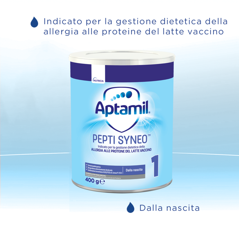 APTAMIL Pepti Syneo 1 è un alimento a fini medici speciali in polvere per lattanti, indicato per la gestione dietetica in caso di allergia alle proteine del latte vaccino.
