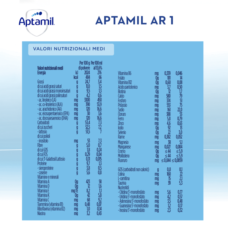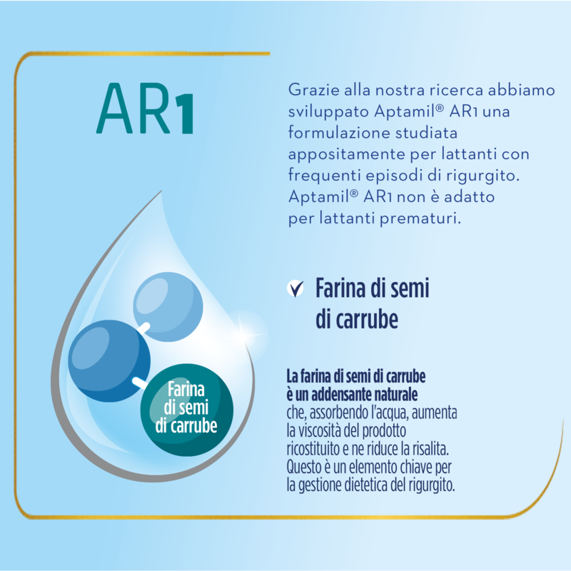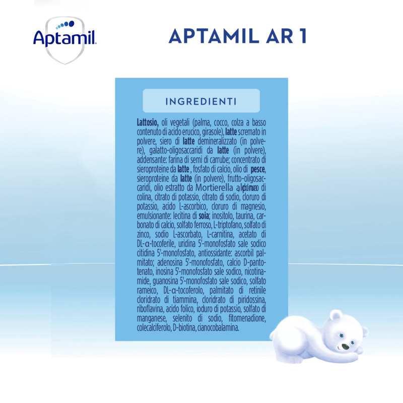 La formula di APTAMIL AR 1 contiene: Prebiotici GOS FOS, l’esclusivo fermentato Lactofidus e anche farina di semi di carrube. Quest’ultima è un addensante naturale che agisce assorbendo l'acqua, così da aumentare la viscosità del prodotto ricostituito e quindi ridurne la risalita: un elemento chiave per la gestione dietetica del rigurgito.