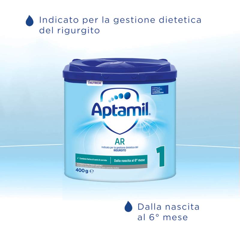 APTAMIL AR 1 è un alimento a fini medici speciali studiato per soddisfare le particolari esigenze alimentari del lattante fino al 6° mese in caso di frequenti episodi di rigurgito.