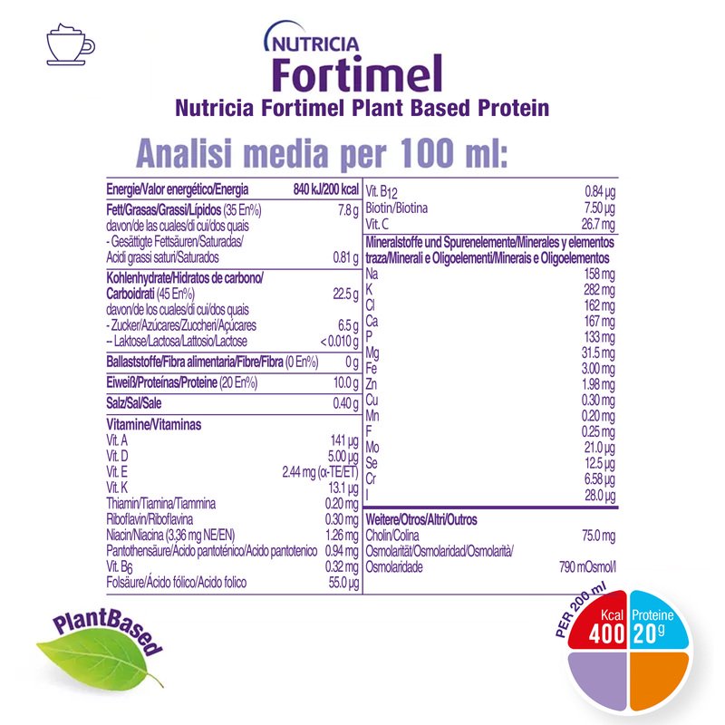 FORTIMEL PLANT BASED PROTEIN è una bevanda vegetale destinata ai fini medici speciali che contiene una miscela di proteine vegetali, a base soia e pisello arricchita con tutti i minerali essenziali, vitamine e oligoelementi necessari al benessere dell'organismo.