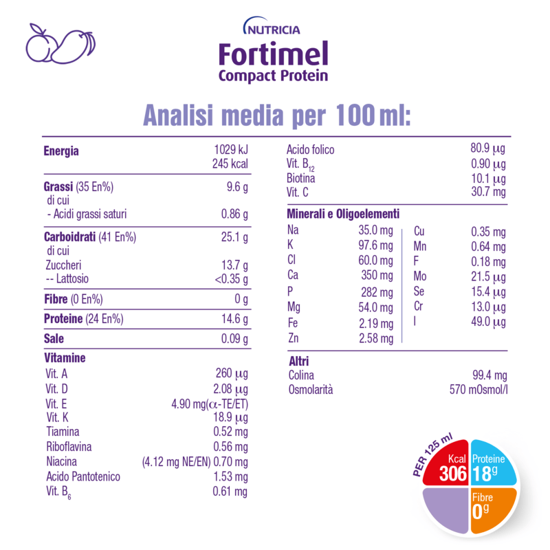 FORTIMEL COMPACT PROTEIN 2.4 kcal/ml è un alimento dietetico destinato a fini medici speciali, iperproteico (18g di proteine a bottiglia) ed ipercalorico (306Kcal a bottiglia), privo di fibre, di glutine e pronto all'uso.