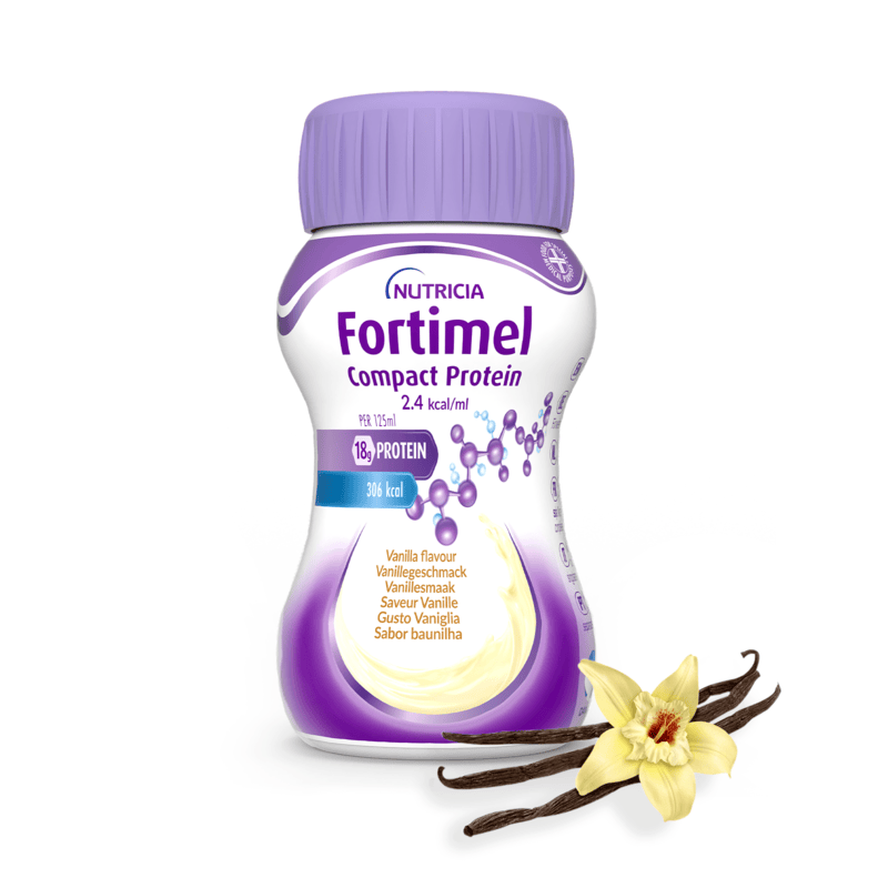 FORTIMEL COMPACT PROTEIN 2.4 kcal/ml è un supplemento nutrizionale orale ipercalorico (306Kcal a bottiglia) ed iperproteico (18g di proteine a bottiglia) concentrato (125ml) al gusto Vaniglia e pronto all’uso, per il trattamento della malnutrizione associata a patologie.