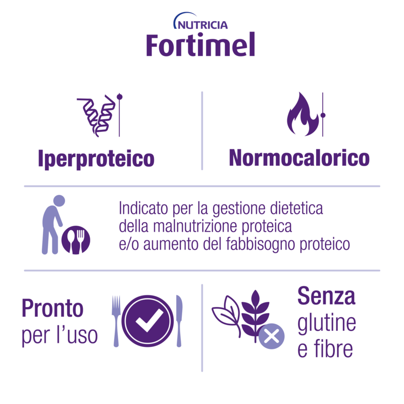 FORTIMEL PROTEIN è un supplemento nutrizionale iperproteico (10g di proteine per 100ml, ossia 20g di proteine per bottiglia), con minerali e vitamine, privo di fibre e di glutine, per il trattamento della malnutrizione proteica associata a patologie e/o per l’aumento del fabbisogno proteico. FORTIMEL PROTEIN è consigliato in associazione alla dieta quotidiana.