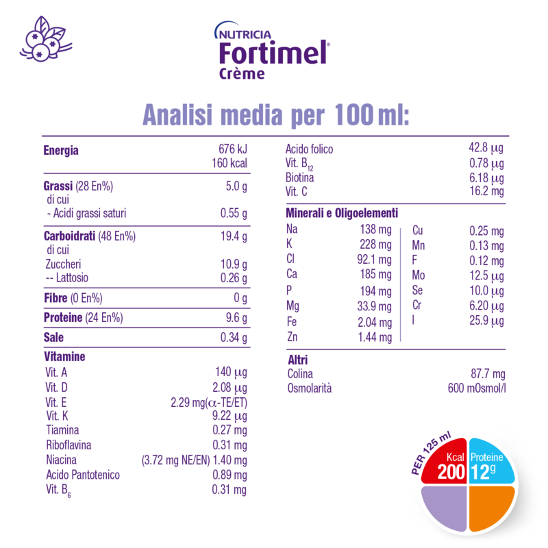 FORTIMEL CREME è un alimento a fini medici speciali per la gestione dietetica della malnutrizione, anche associata a patologia, da utilizzare sotto il controllo del medico.